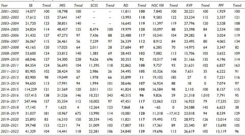 This study intends to present the trend analysis of receipts and outstandings of each scheme with the help of tables and line charts from 2001–2002 to 2021–2022. The trend of receipts will help to understand the performance of each scheme and its role in generating funds from households for promoting capital formation in the Indian economy. Receipts for saving schemes mean the amount invested under different schemes by postal investors, and outstandings mean the balance left under different saving schemes, which constitute liabilities of the central government. Receipts and outstandings are expressed in crores, and the trend is presented in percentages by taking the previous year as the base year. The performance and trend analysis of postal schemes is presented using tables and line charts, as shown below.