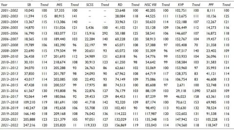 Similarly, Moorthy (2001) recommended an inflation-adjusted formula for setting interest rates on provident funds and small savings for effective running. However, the safety and security provided by postal savings still encouraged people to invest in postal savings, as noted by Jothilakshmi and Santhi (2019), Ghosh (2007), Priyadarshee et al. (2010) and Sahoo and Gomkale (2015). Growing demand for saving schemes also attracted investment from people receiving disbursement of MGNREGA, social security pension schemes, Indira Gandhi National Old Age Pension Scheme, Indira Gandhi Matritva Sahyog Yojana and conditional cash transfer (CCT); these, therefore, induced an upward saving trend according to Malakar (2013).