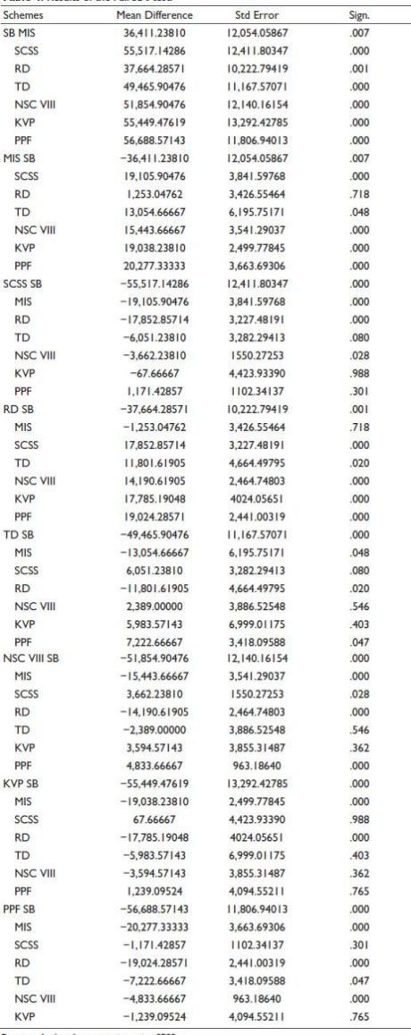 From Table 4, on considering pairs of significant differences or pairs with a p value less than .05, it was found that receipts of SB were significantly different from the other six schemes; in the case of the RD scheme, receipts vary from the other five schemes. PPF, MIS and NSC VIII showed differences in their receipts from the four schemes, respectively. SCSS and KVP revealed significant differences in their receipts from three schemes, whereas TD presented the least difference in mean score from the SB account only. The p value of significant results was highlighted in Table 4.