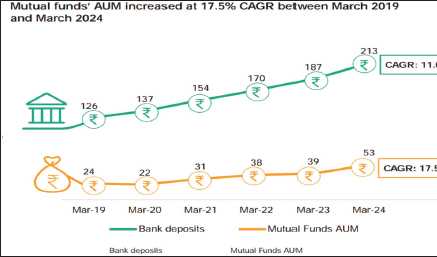 212.53 lakh crore in March 2024. Investor preferences have shifted because low interest rates on fixed deposits have encouraged them to consider higher-return options such as mutual funds.