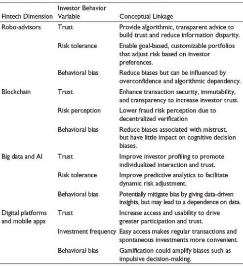 Table 2. Conceptual Framework That Maps Fintech Dimensions to Investor Behavior Variables Such as Trust, Risk Tolerance, and Behavioral Bias.