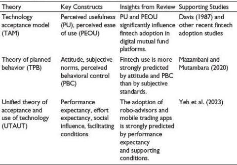 The conceptual linkage between FinTech dimensions and investor behavior variables is summarized in Table 2. Theoretical foundations explaining technology adoption and investor behavior are summarized in Table 3.
