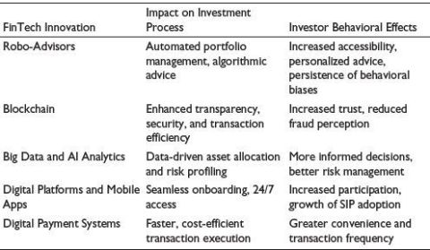FinTech innovations are changing the way people participate in mutual funds by increasing investor participation, accessibility, and convenience. Technologies include mobile trading apps, blockchain platforms, robo-advisors, and big data analytics, enabling real-time data, customized recommendations, and faster transactions. However, investment behavior is still influenced by behavioral biases and regulatory constraints. To establish a transparent, safe, and inclusive investment framework, legislators, banks, and tech companies must work together. Future research should investigate how fintech impacts different investor types, ethical considerations, and the effectiveness of regulations. The influence of various FinTech innovations on the mutual fund investment process and investor behavior is presented in Table 4.